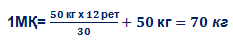 Мысалы, сіз салмағы 50 кг штангамен, максималды 12 рет отырып тұрдыңыз делік, енді сіздің 1МҚ-ды формула арқылы анықтайық.