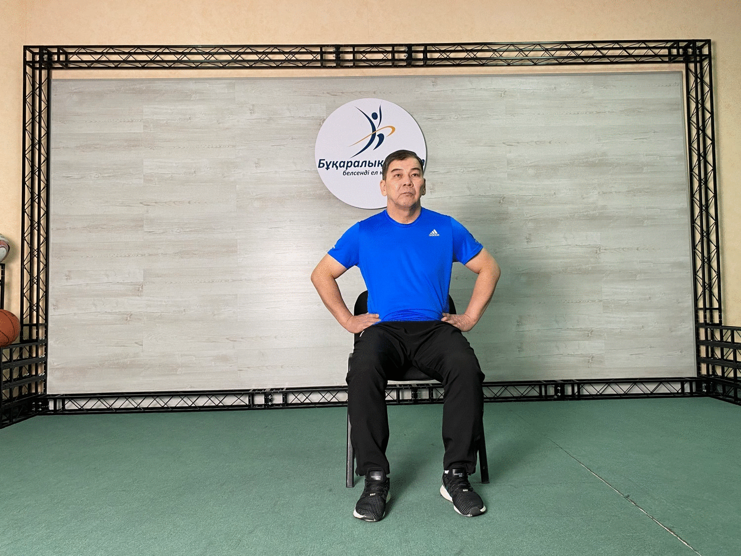 Б.Қ. отырып. Күш сала отырып екі аяқты көтеру (демді ішке тарту). Б.Қ. (демді шығару). 5-10 рет қайталау.