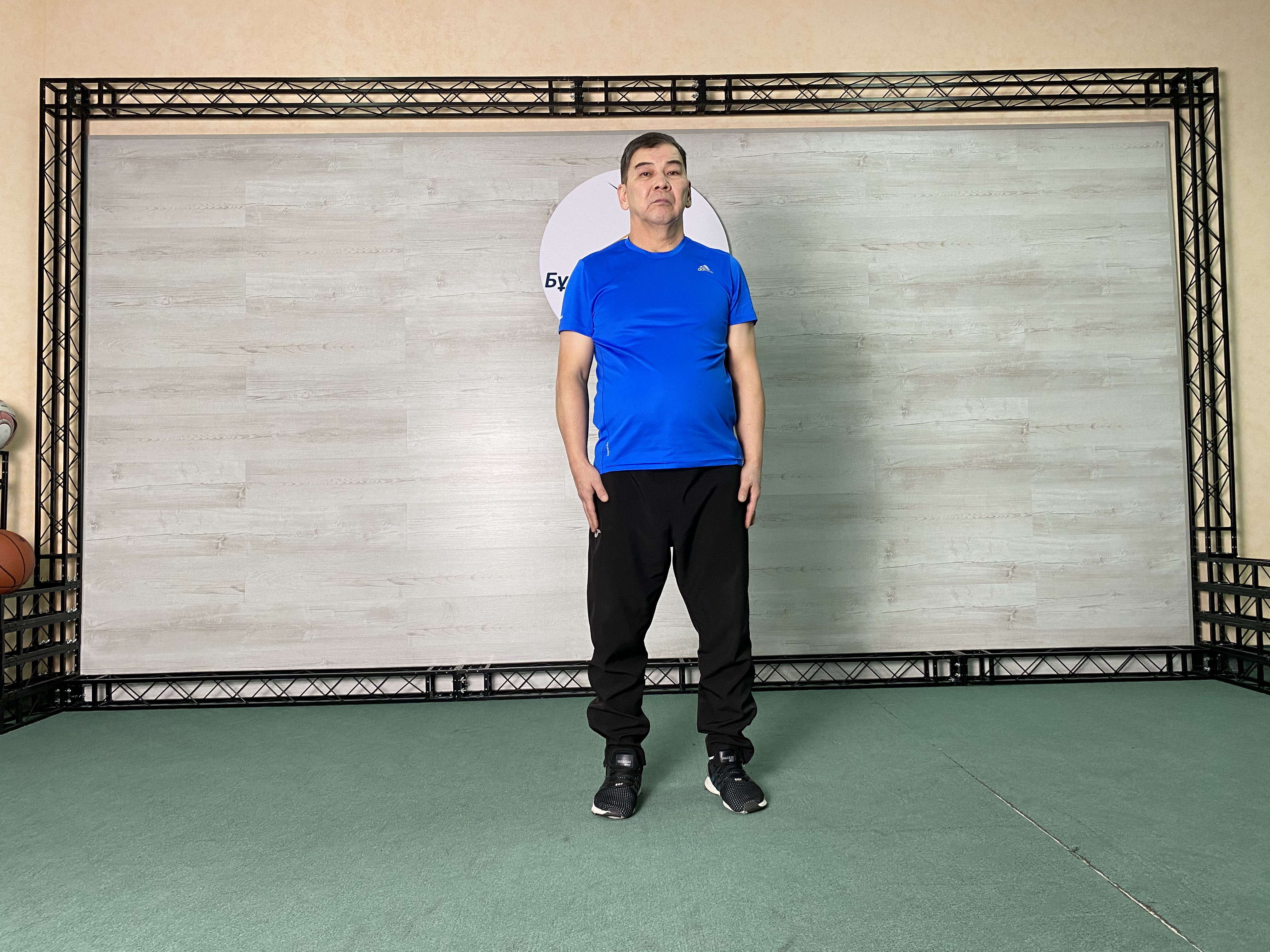 Б.Қ. түрегеп тұру. Екі жанына иілу (демді ішке тарту). Б.Қ. (демді шығару). 5-10 рет қайталау.